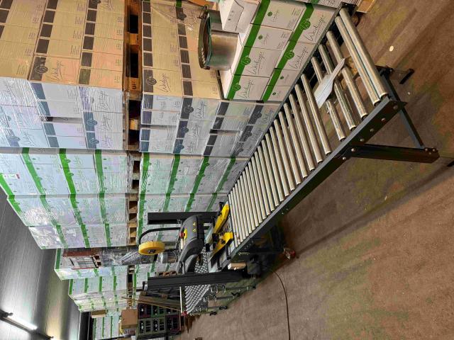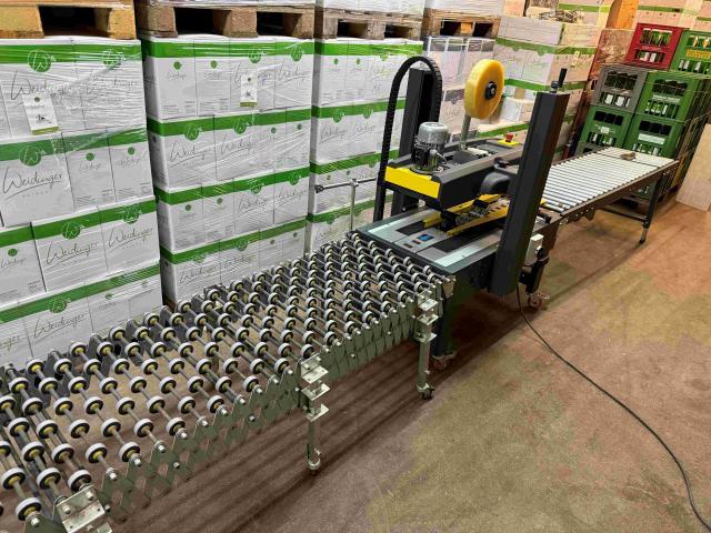Verkaufe einen Kartonverschließer mit Rollenbahn inklusive Kartonhalter und Ausziehrollen für fertige Kartons.